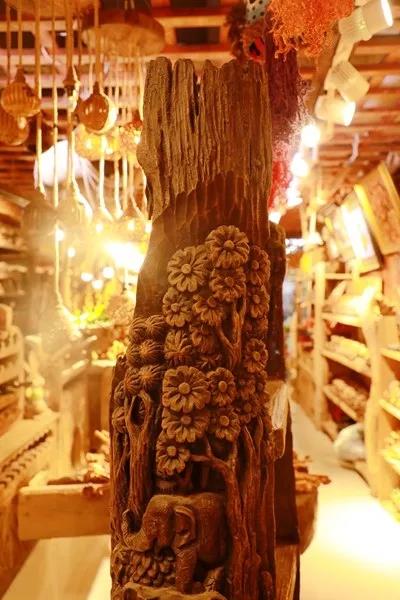 店(diàn)面約300多平方,采用(yòng)空(kōng)間套空(kōng)間,“回”形布局。店(diàn)裏被各式老(lǎo)木(mù)藝品、旅遊工(gōng)藝品塞得滿滿當當。